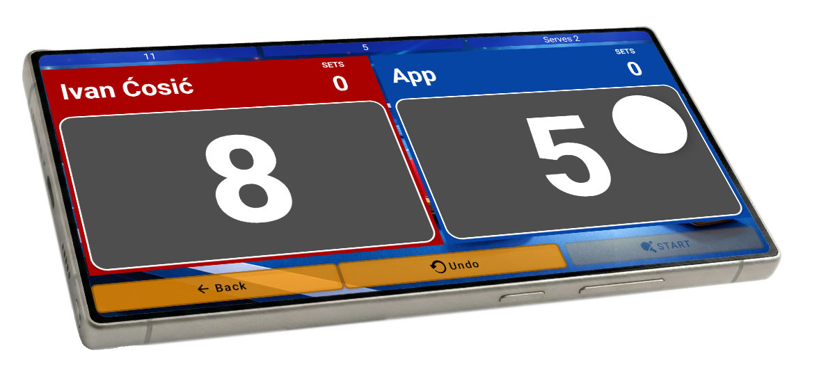 ⏪ Undo (Središnji narančasti gumb): Jedna od najvažnijih tipki! Ako ste slučajno dodali bod krivom igraču, jedan klik na Undo vraća rezultat na prethodno stanje i ispravlja poziciju servisa. Sudac će također glasovno potvrditi ispravak.