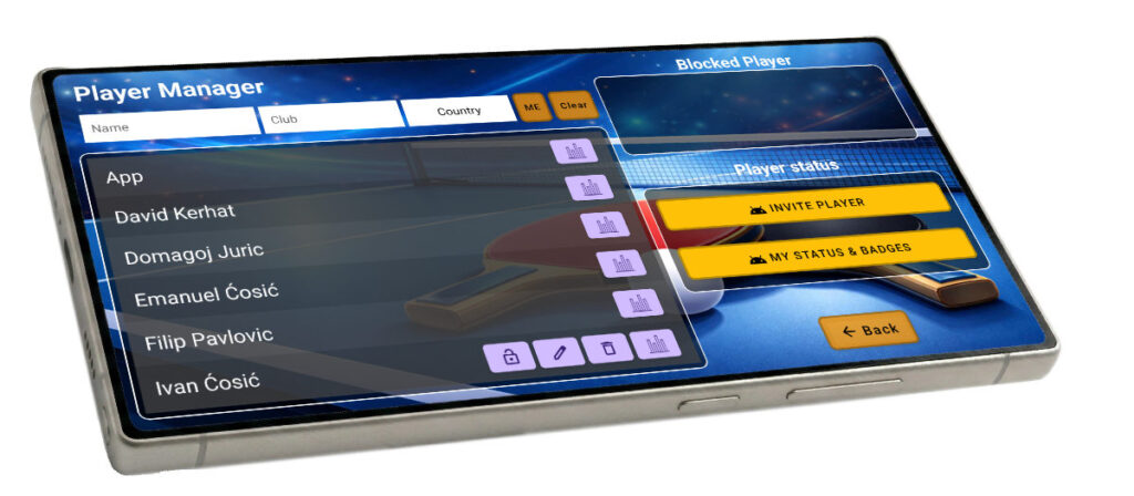 Ekran Player Manager srce je društvenog aspekta aplikacije. On vam omogućuje da organizirate svoju zajednicu, pretražujete protivnike iz globalne baze ili dodajete lokalne igrače s kojima često trenirate.